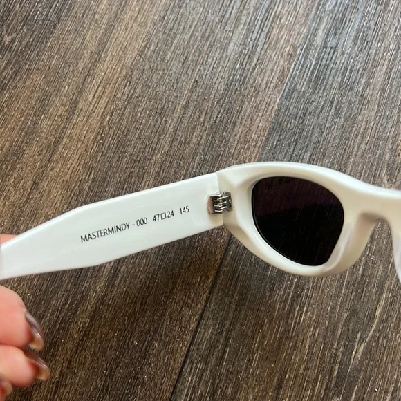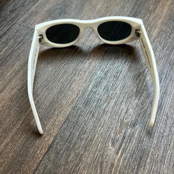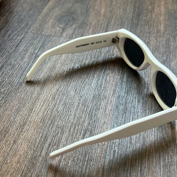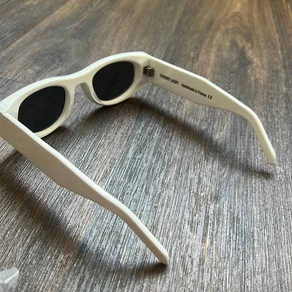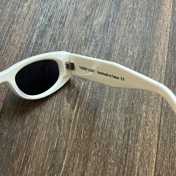 Thierry Lasry MASTERMINDY SunglassesOne arm doesn’t touch groundWhite with solid black lensesComposition: acetate100% UV protectionHandmade in FranceIncludes a microfiber pouch, a hardshell case, and a signature THIERRY LASRY boxSKU: MASTERMINDY000This frame can be fitted with prescription lenses.MEASUREMENTSWidth: 145mmHeight: 43mmLens: 48mmBridge: 25mmTemple: 143mm