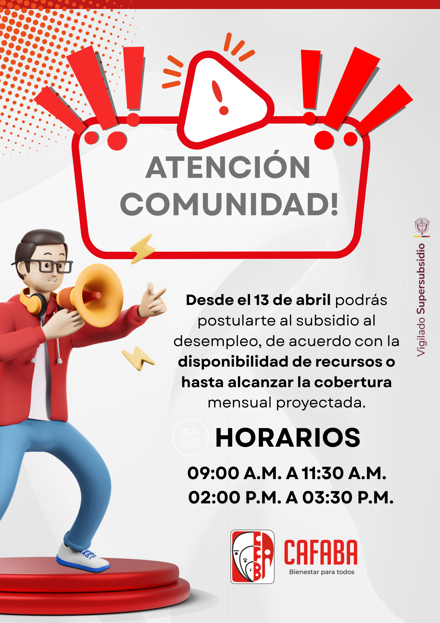 La novedad de ingreso a laborar la puedes reportar en nuestra página web https://www.cafaba.com.co/fosfec/ diligenciando el formulario de Suspensión del subsidio de desempleo, en nuestras oficinas de agencia de empleo Cafaba de manera presencial o a través del correo electrónico contactofosfec@cafaba.com.co