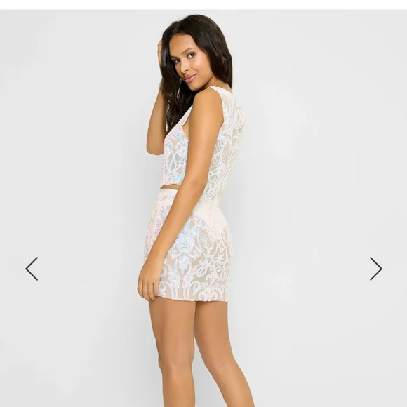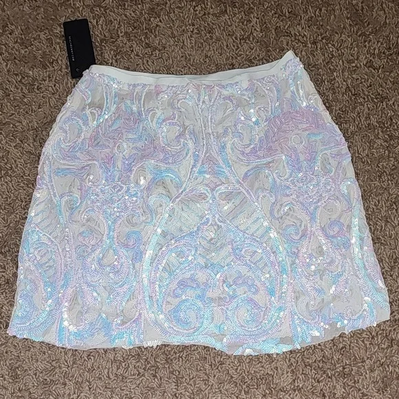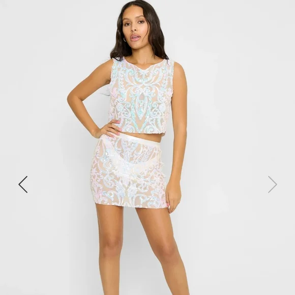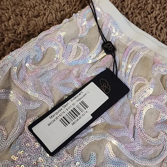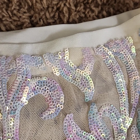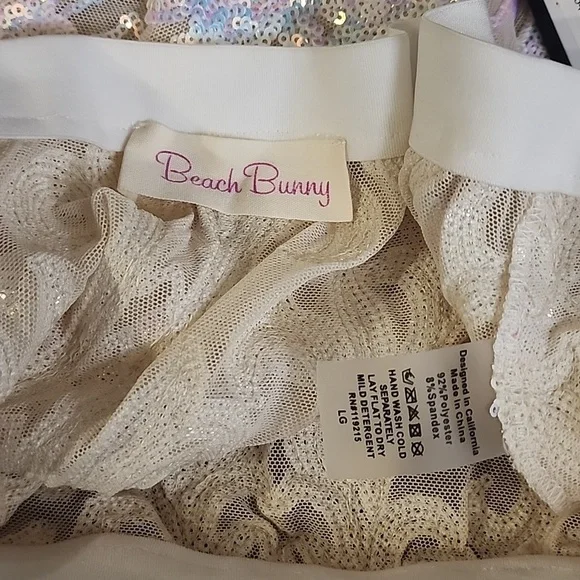 Beach BunnyMarquise Irridescent Sequin Mini Skirtvery stretchy! runs bigperfect for a swim coverup or disco cowgirl bachelorette night out! sheer but would be fine with nude boyshorts or cheekiesNWTwaist 28" but stretches to 32" (large)waist 26.5" but stretches to 31" (med)Waistband is softer than expected and doesn't squeeze like most beach bunny so it's wonderful! 38" hip but stretches to around 46" (large)36" hip but stretches to 43" (medium)**matching top available in Small in separate listing