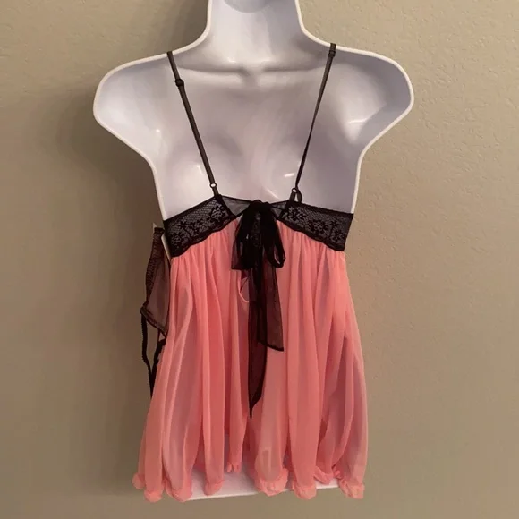 Chiffon Lace mesh baby doll with thong. Adjustable straps.