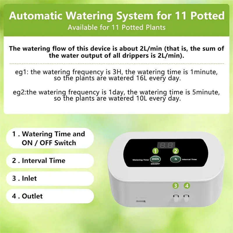 【Precise Plant Care】: This indoor plant watering system easily adjusts the watering time from 1 minute to 30 minutes, which is suitable for both short and deep watering. Watering intervals are 3H, 6H, 12H, 1d, 2d, 3d, 7d(3H for 3 hours, 1d for 1 day, and so on)suitable for both frequent watering and longer watering intervals. Experience the ultimate flexibility in nurturing your plants and enjoying a lush oasis of green, your gardening work will become easier and more efficient.