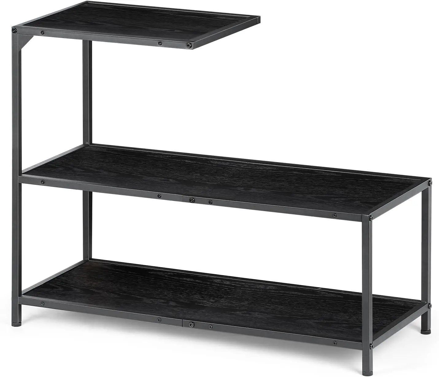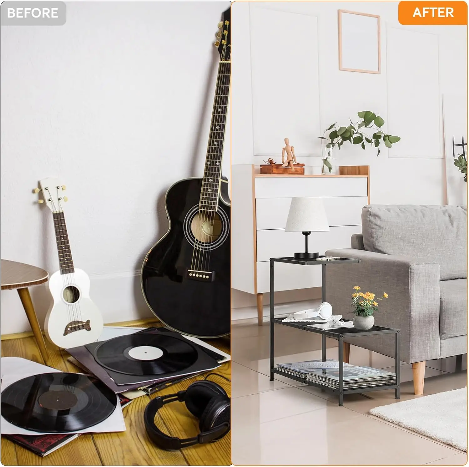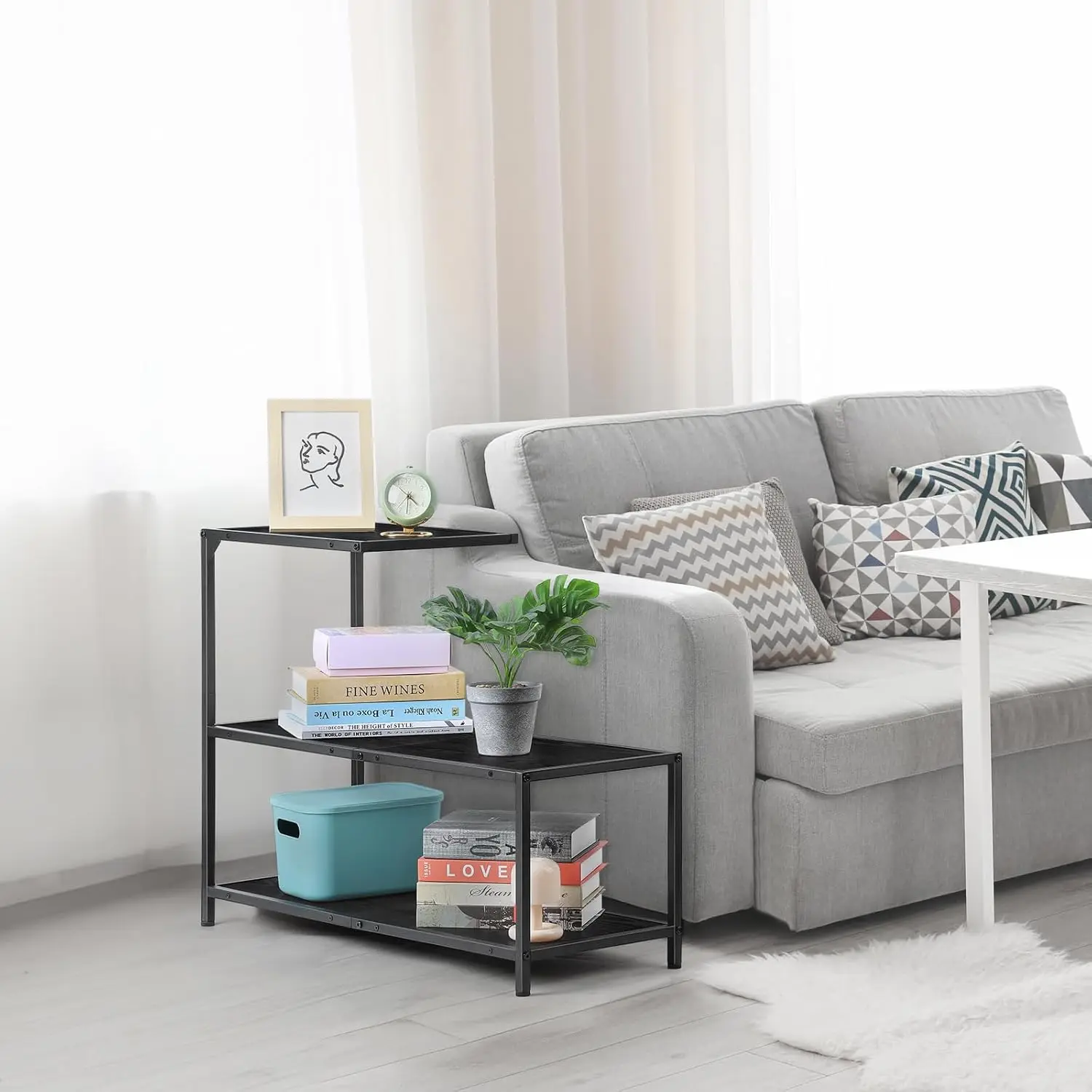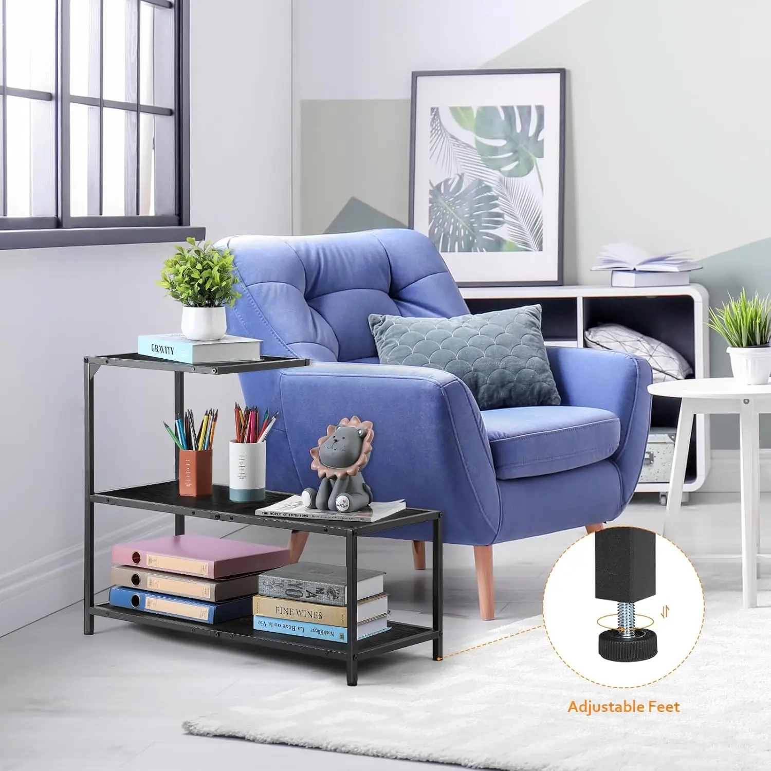 【Ample Storage Space】 The 3-tier sofa side table gives you ample storage and display space. The top is perfect for Coffee cups, remote controls, etc, and the 2 lower shelves are ideal for displaying your books and daily necessities. 3 open shelves ensure easy access