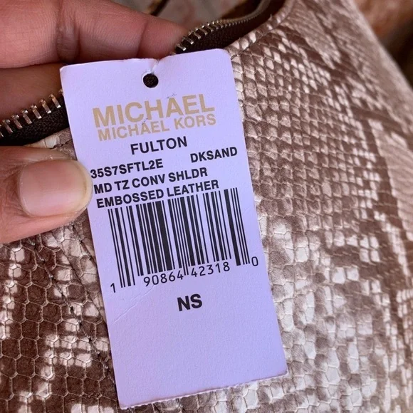 Michael Michael KorsFulton Medium Top Zip Convertible Shoulder Bag Dark Sand with Gold tone hardwareNew with Tags. Authenticity Guaranteed!Embossed Leather Buckled small shoulder strap with logo charm ringsAdjustable crossbody strapTop zip closureInterior zip pocket,2 interior slip pocketsExterior snap pocketStraps 4.5" and 19" dropLength: 11"Height: 8 1/4"Depth: 4" Fast shipped from USA