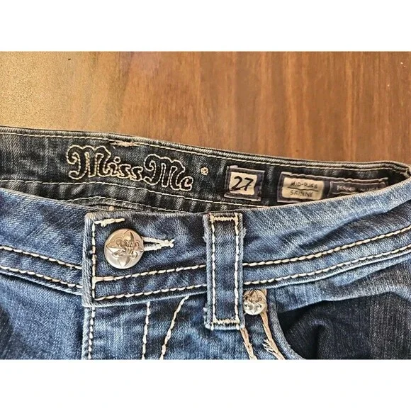 Item as picturedThe product is a pair of Miss Me women's jeans in a mid-rise skinny style, size 27. They are in a classic blue color and are designed for a regular fit. With a waist size of 27 inches, these jeans are perfect for women looking for a stylish and on-trend denim option in a flattering and comfortable size.