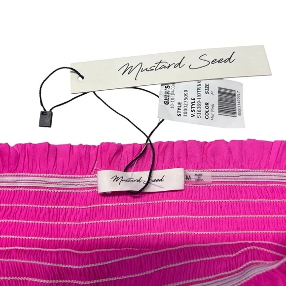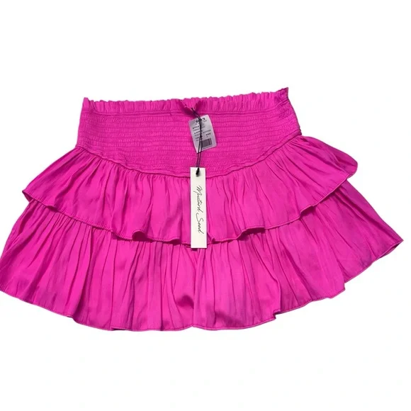This playful mini skirt by Mustard Seed features a vibrant hot pink hue and a charming tiered design. The ruffled layers add volume and movement, making it perfect for casual outings or resort wear. Its elastic waistband ensures a comfortable fit, while the lightweight fabric enhances its flirty silhouette.Size Medium (stretchy)Approximate measurements: 28-32”W x 15”L.NWT, no flaws.