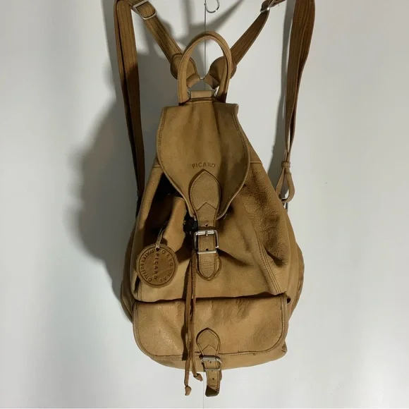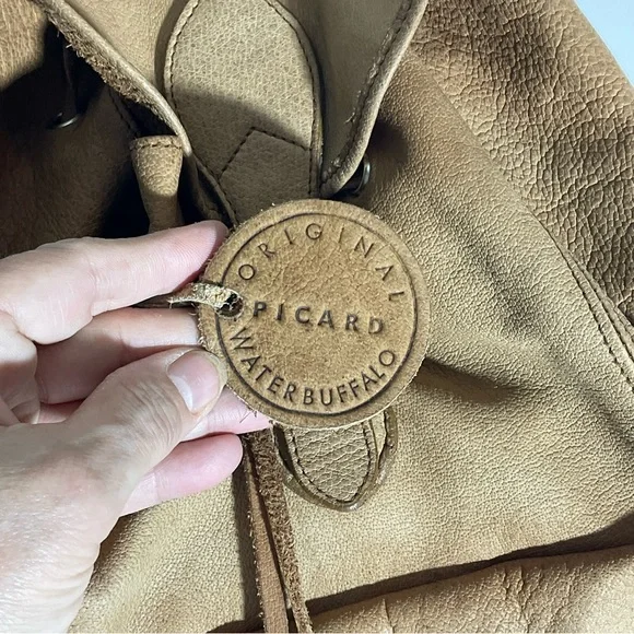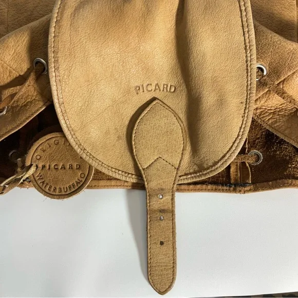 Picard Soft Water Buffalo Leather Backpack w/Large Inside & Outside Buckle Closure pockets. Backpack has adjustable straps and interior opening has an additional drawstring closure. Backpack has a rustic/rugged look & feel and is super cool! Bag is pre-owned & does show signs of wear so please view all pictures. Bundles do receive the best deal & offers are certainly welcome.Materials: Water Buffalo Leather