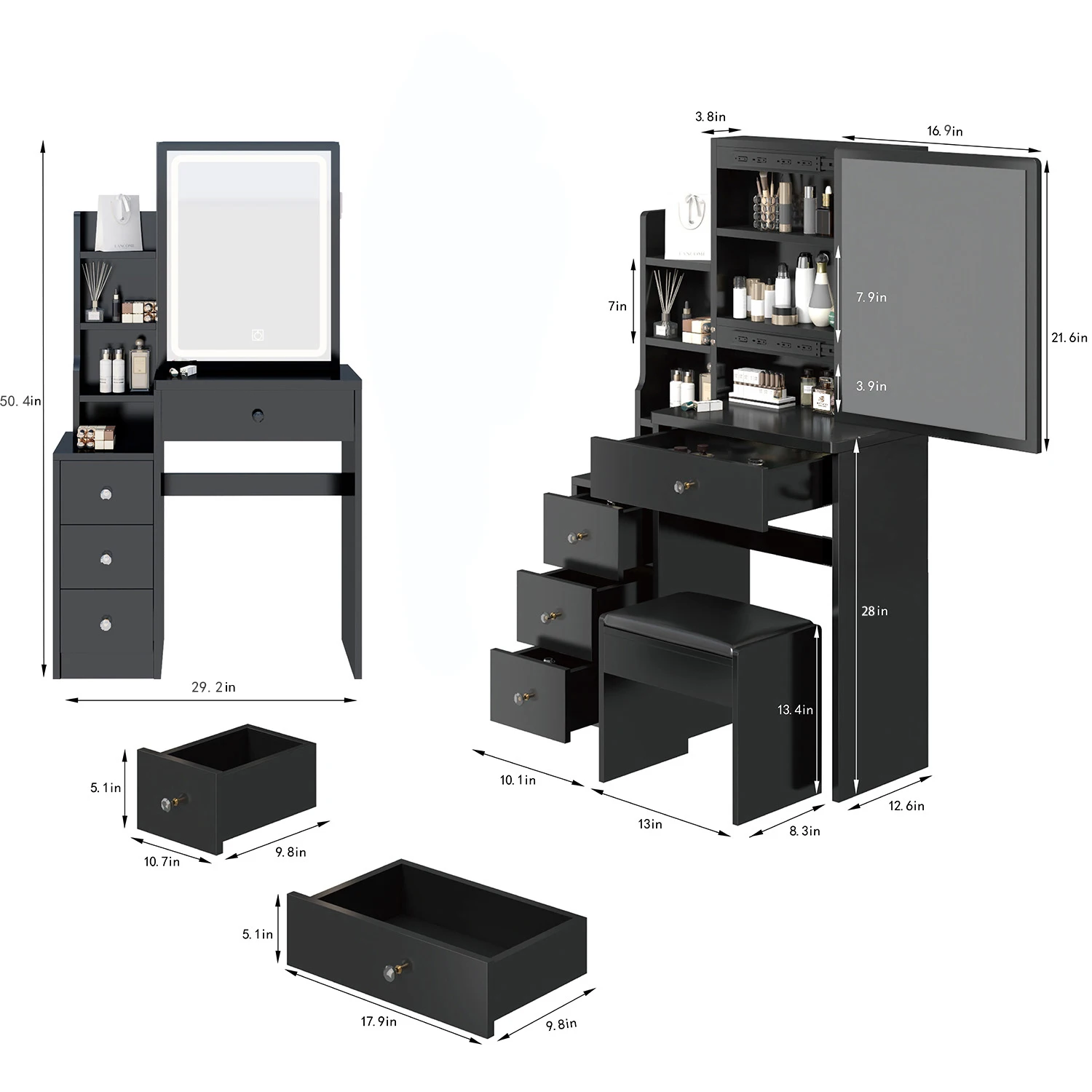 [Designed for small space]: This vanity table set is 29.2" in length and 50.4" in height, designed specifically for small bedrooms. Its advantage is that it takes up less space, so its size is not large. Before purchasing, please note that this is a small-sized dressing table, choose the appropriate size of dressing table according to the user's body shape and the size of the space where the dressing table is placed.
