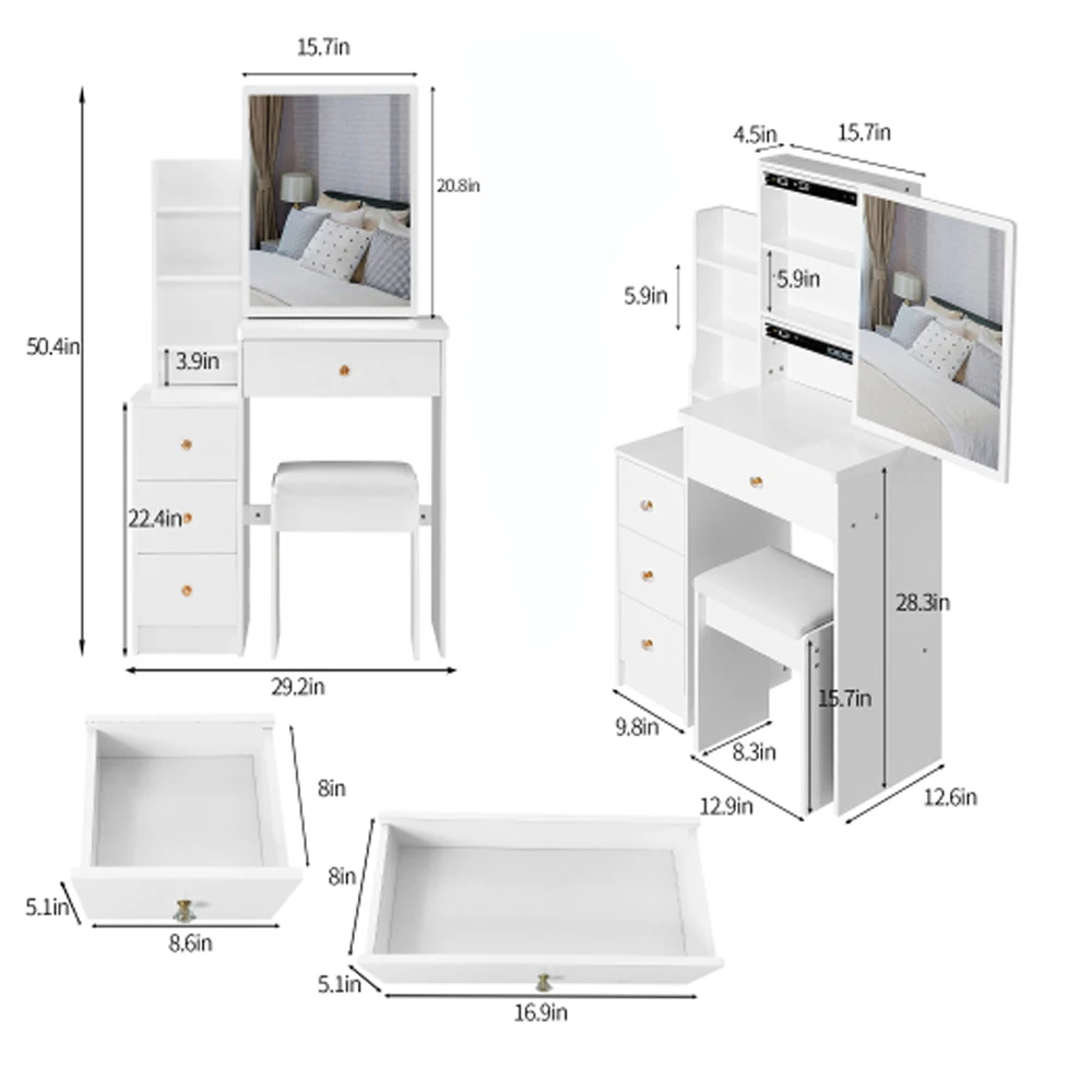 [Includes a padded dressing table stool]: The packaging includes a dressing table and a padded stool. You will no longer need to make additional purchases. This will greatly save you time and delivery cost.