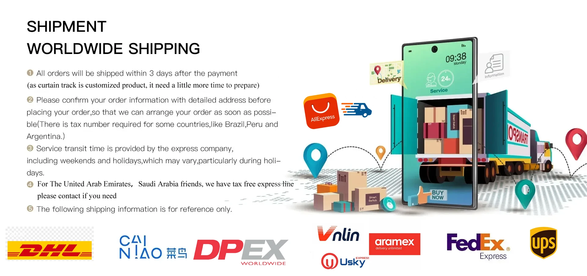 Subject to logistics rules, we will cut the track to a maximum of 1.2M or 1.5M(depends on country) and send it in sections. Buyers need to install it by themselves. The default logistics is international express delivery DHL, Fedex, UPS, EMS, Cainiao Heavy Parcel Line.