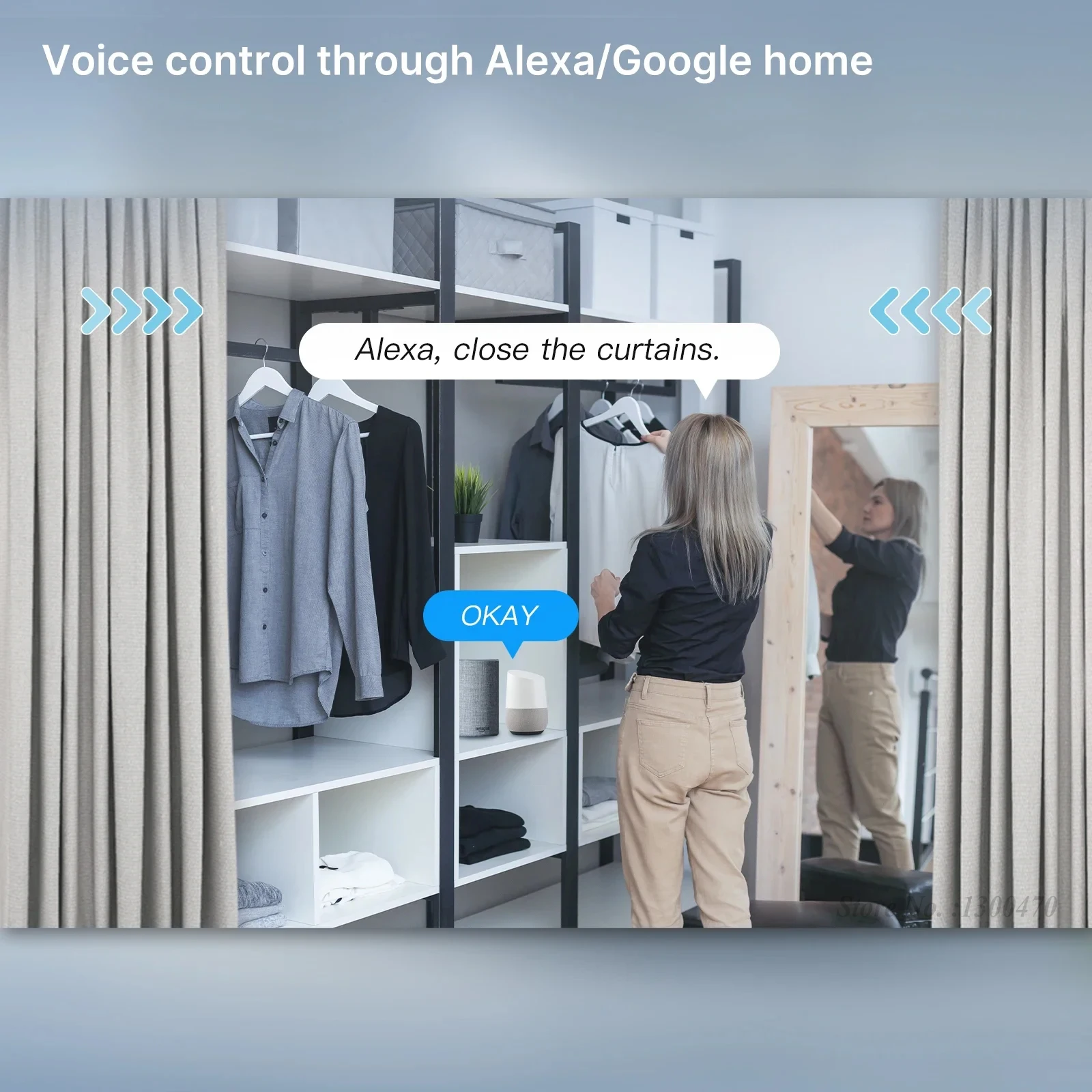 This TUYA smart home wifi curtain motor drive support voice control. you can open and close curtains through Alexa and Google Assistant