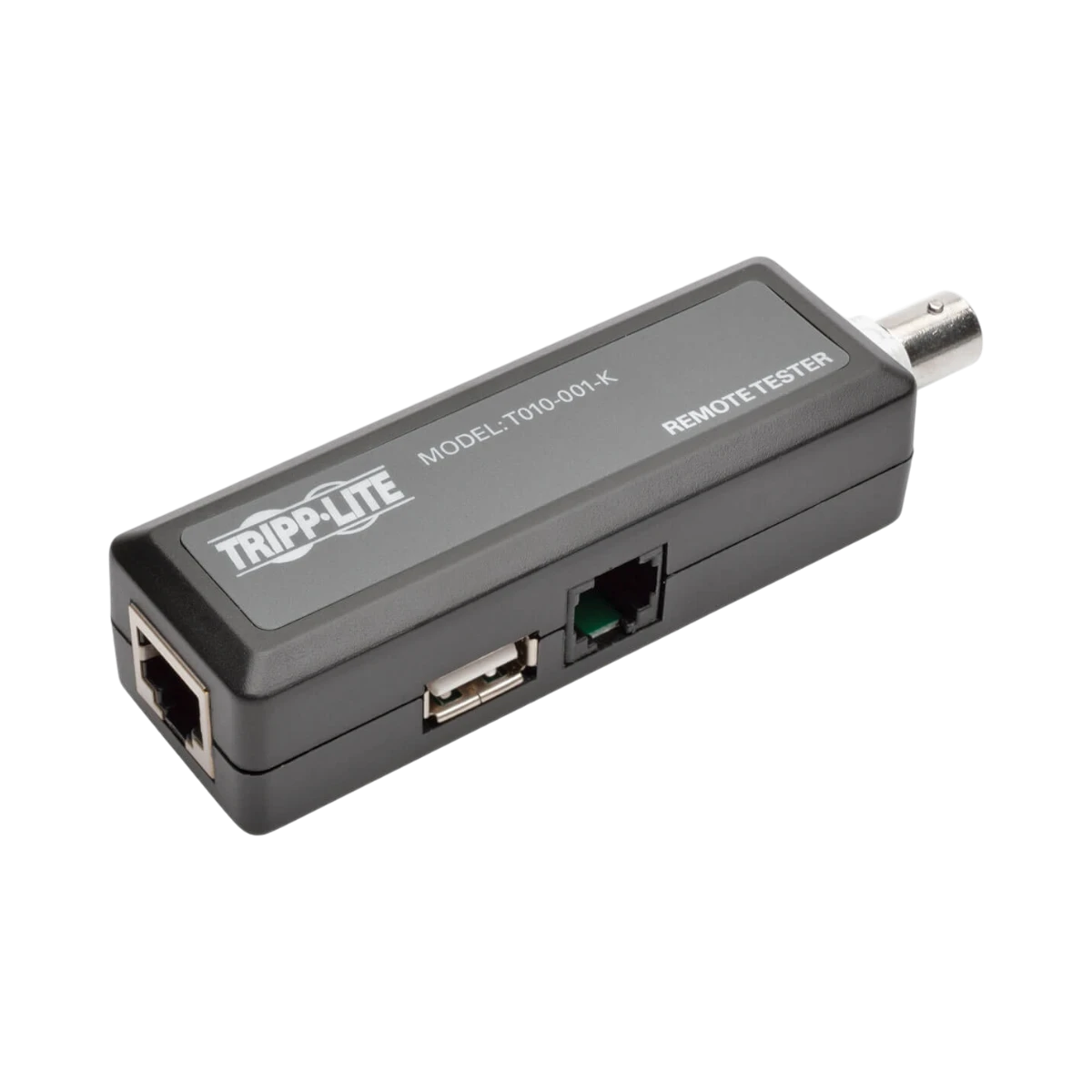 The Tripp Lite T010-001-K is a multi-function cable tester that helps network installers and telecom professionals spot wiring problems quickly. It works with RJ45 Ethernet, RJ11 telephone, BNC coaxial, and USB leads, so one device covers nearly every common low-voltage cable you might encounter on a job.