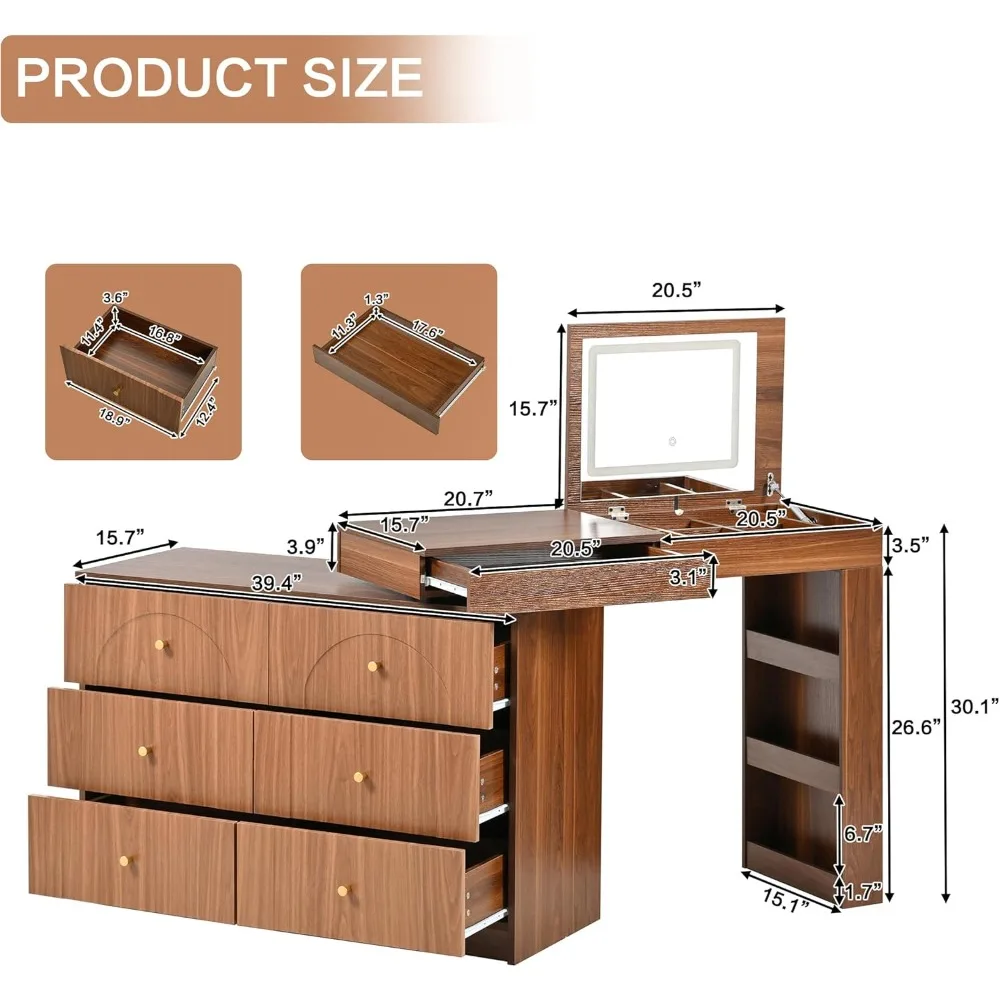 • 【Spacious Vanity Table with Abundant Storage】: This vanity table is designed with ample storage space to keep all your beauty essentials neatly organized. It features 6 large drawers and 1 shallow drawer—perfect for storing everything from makeup palettes to jewelry and daily accessories. Additionally, it includes 9 small compartments under the flip-top and 3 open storage shelves, offering easy access to perfumes, skincare, and decorative items
