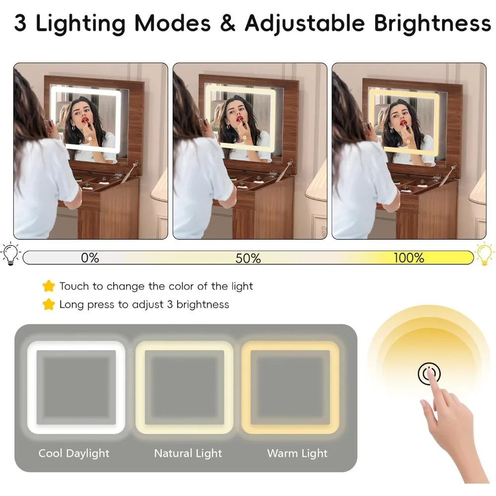 • 【Makeup Vanity Table with Adjustable Brightness】: This vanity table comes equipped with a built-in LED light, designed to give you perfect lighting for your beauty routine. You can easily change the lighting effect by simply long pressing the touch-sensitive switch. The LED light offers 3 brightness models—cool daylight, natural and warm light—so you can easily adjust it to match the time of day or your personal preference