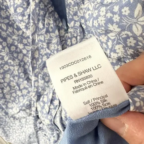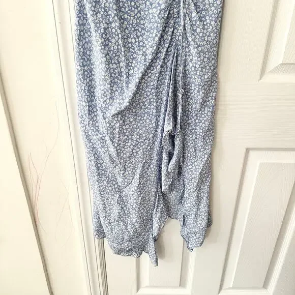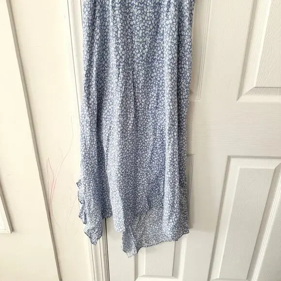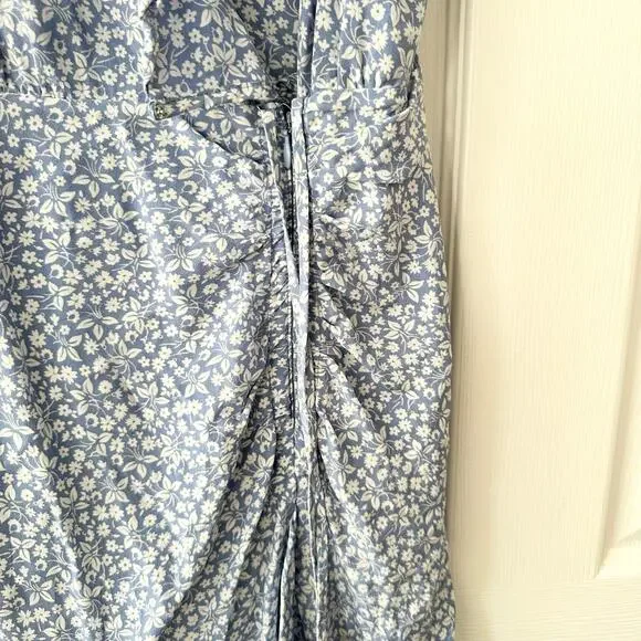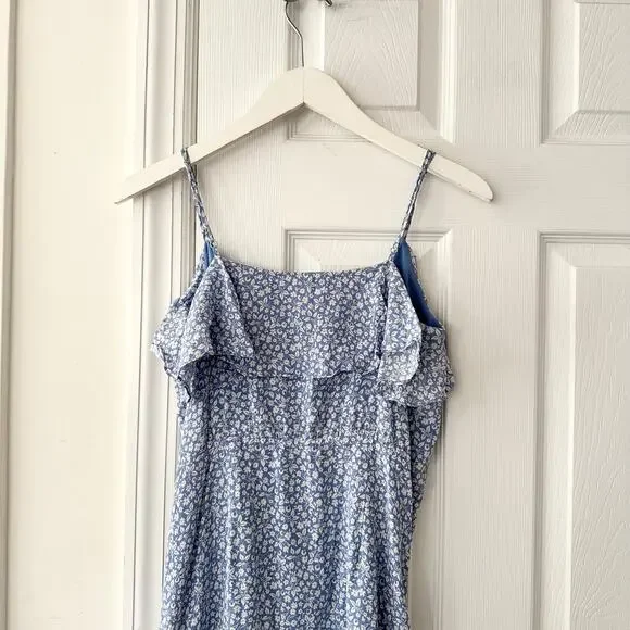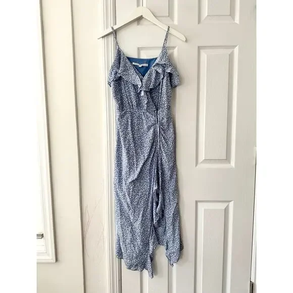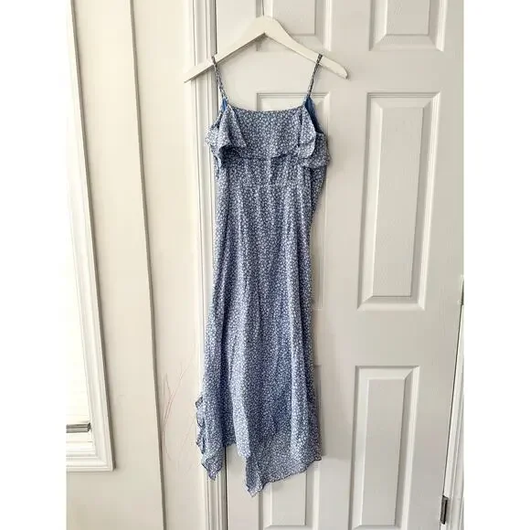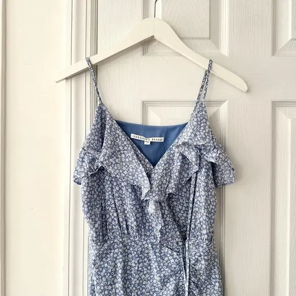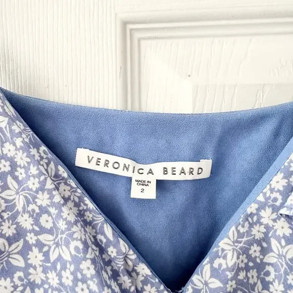 Size 2 from Veronica Beard. Style name Monica. 100% silk. Blue with white floral print midi length high slit floral and ruffle detail along chest. Adjustable straps. Front waist side zip above ruching. Lined. Preowned in good condition with no stains or tears.Measurements: approximateChest 14”Waist 12”Length 50”All items come from a smoke free/pet free home. No trades or modeling. As always, offers are welcome. Thanks for stopping by!