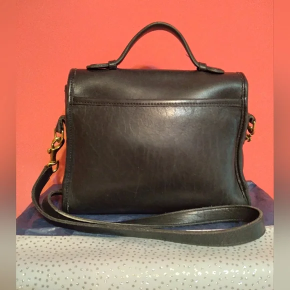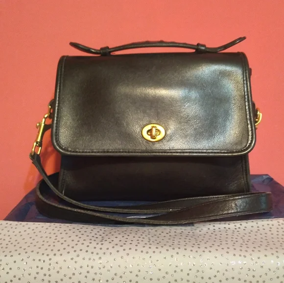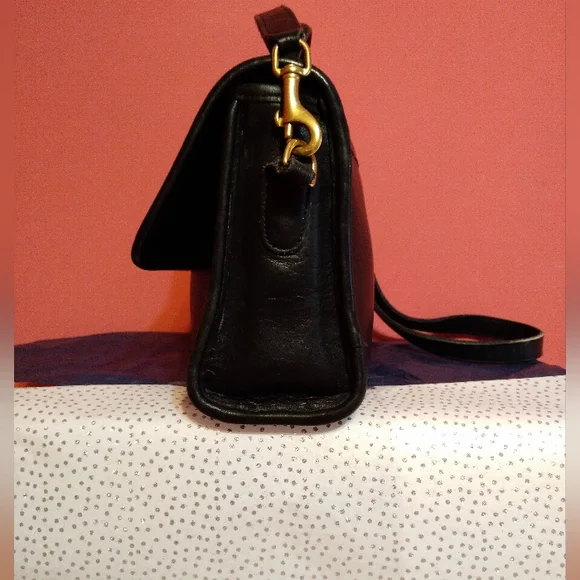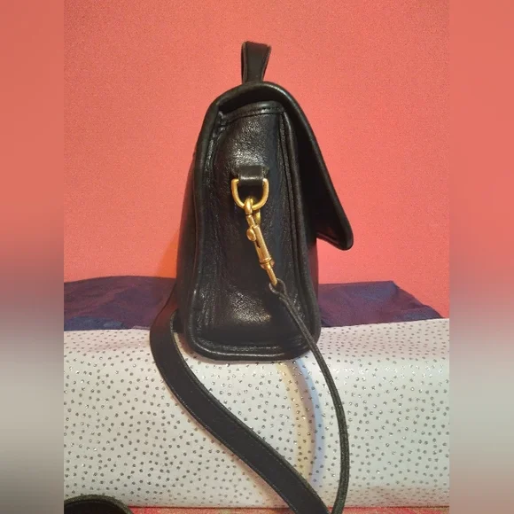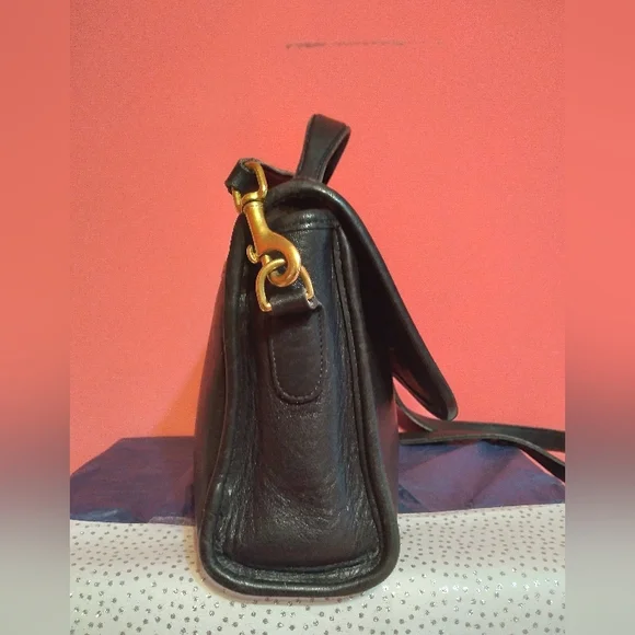 Vintage Coach Court black bag debut 1989 features flap closure, inside zipper pocket, handle outside slip pocket, detachable crossbody strap. All metal brass features are original Coach and working properly. Condition: Very good vintage condition. Shows few scratches on back and minor leather stretch as with any vintage piece, no hang tag.Clean inside and out. Very well kept with leather conditioned regularly. No.G6C-9870Approx Measurements 9.5" l8" h3.5"wSmoke-free, Pet-friendly home.Items that are NWT are new with tags. Most items are preloved and/or vintage, which means they will include minor wear and will be identified as such. I try to describe all items thoroughly and include photos before sale.All comments throughonly, no emails. Thank you!*Photo style reference only