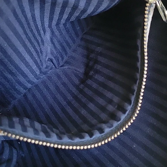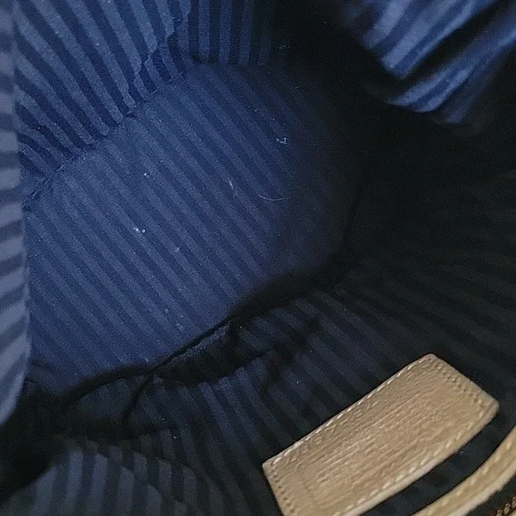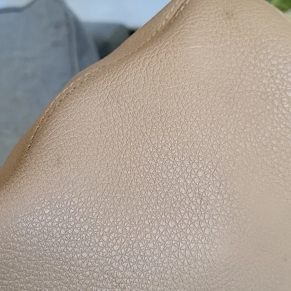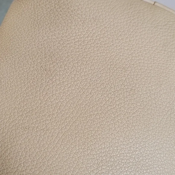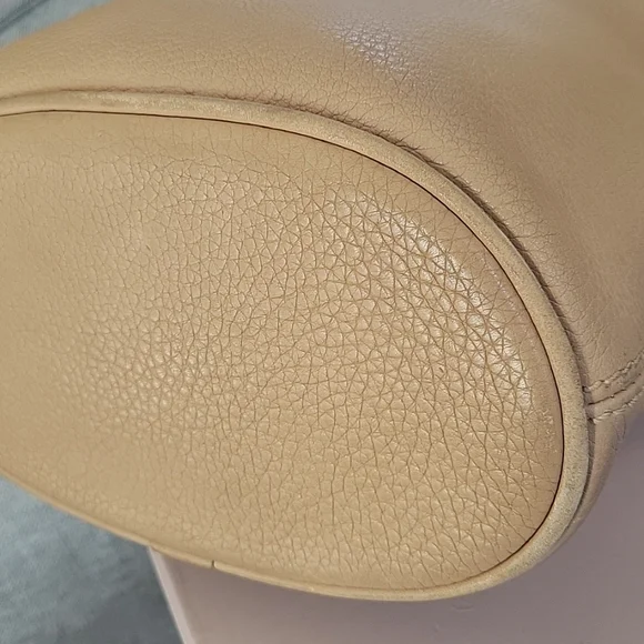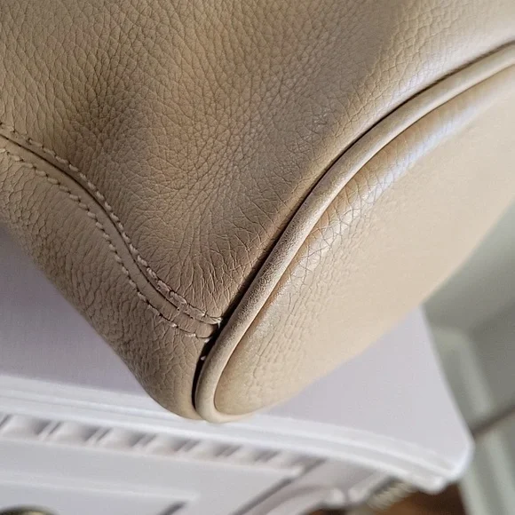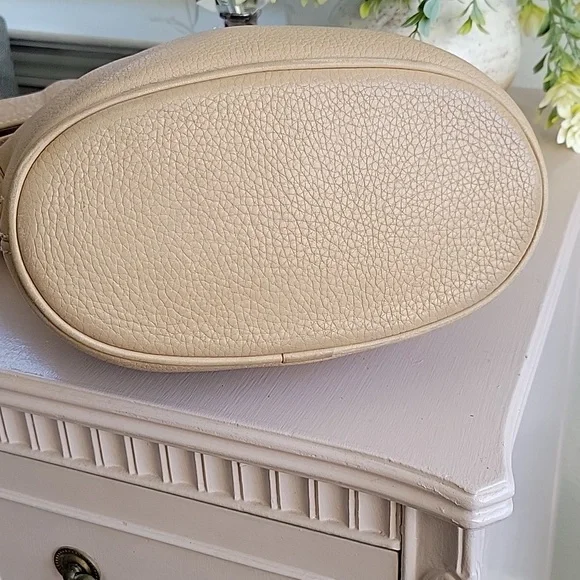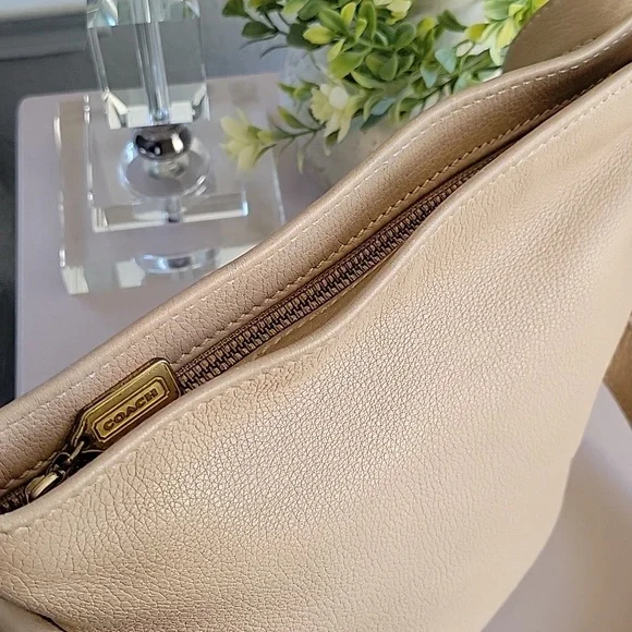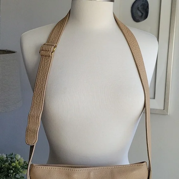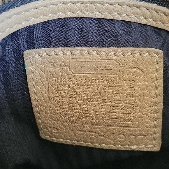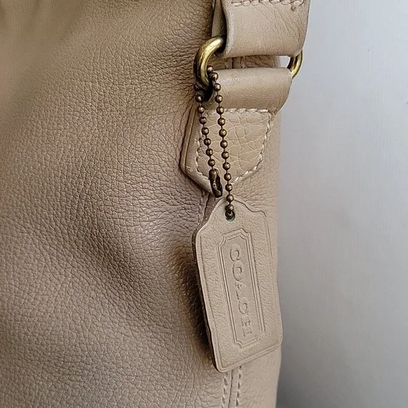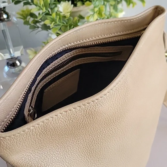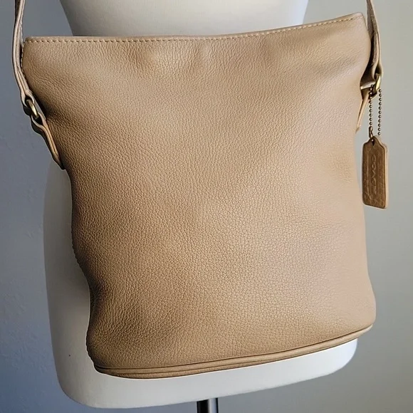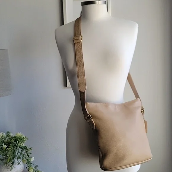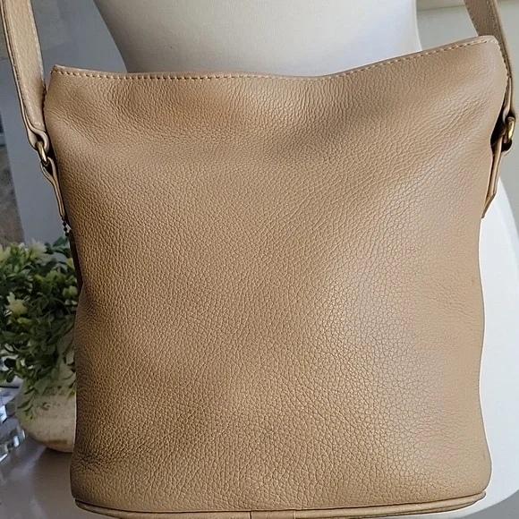 In great vintage condition, the bag was made in 1997 in USA.*Pebbled leather in Sand color*Adjustable strap with a 27" max drop*Navy fabric interior lining with zippered pocket *Zipper closure *Original hang tag included The only call outs are some very light marks. See images.Cleaned and conditioned with Leather CPR 10"Lx10"Hx5"W